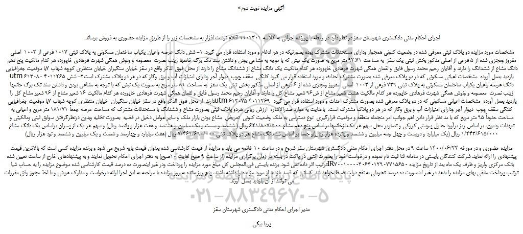 مشخصات مورد مزایده دو پلاک ثبتی معرفی شده در وضعیت کنونی همجوار ودارای مستحدثات مشترک بوده بصورتیکه در هم ادغام و مورد استفاده قرار می گیرد. 1- شش دانگ عرصه واعیان یکباب ساختمان مسکونی به پلاک ثبتی 1017 فرعی از 1003 اصلی مفروز ومجزی شده از 5 فرعی از اصلی مذکور بخش ثبتی یک سقز به مساحت 92.71 متر مربع به صورت یک نبش که با توجه به مشاعی بودن و داشتن سند تک برگ خانمها زینب نصرت معصومه و ونوش همگی شهرت فرهادی خاپورده هر کدام مالکیت پنج دهم دانگ مشاع از ششدانگ را دارند و آقایان رحیم محمد رسول فایق و لقمان همگی شهرت فرهادی خاپورده هر کدام مالکیت یک دانگ مشاع از ششدانگ مشاع را دارند از محل فوق الذکر واقع در سقز خیابان سنگبران خیابان منتظری کوچه شهاب 7با موقعیت جغرافیایی utm 613080 4011265 بازدید بعمل آورده مشخصات اعیانی مسکونی که در دو پلاک معرفی شده بصورت مشترک احداث و مورد استفاده قرار می گیرد کلنگی سقف چوب دیوار آجر ودارای امتیازات آب و برق وگاز که در هر دو پلاک مشترک است2- شش دانگ عرصه واعیان یکباب ساختمان مسکونی به پلاک ثبتی 739 فرعی از 1003 اصلی مفروز ومجزی شده از 6 فرعی از اصلی مذکور بخش ثبتی یک سقز به مساحت 89 متر مربع به صورت یک نبش که با توجه به مشاعی بودن و داشتن سند تک برگ خانمها زینب نصرت معصومه و ونوش همگی شهرت فرهادی خاپورده هر کدام مالکیت هشت شعیر مشاع از ش96 شعیر مشاع کل را دارند و آقایان رحیم محمد رسول فایق و لقمان همگی شهرت فرهادی خاپورده هر کدام مالکیت 16 شعیر مشاع از 96 شعیر مشاع کل را دارند از محل فوق الذکر واقع در سقز خیابان سنگبران خیابان منتظری کوچه شهاب 7با موقعیت جغرافیایی utm 613075 4011269 بازدید بعمل آورده مشخصات اعیانی مسکونی که در دو پلاک معرفی شده بصورت مشترک احداث و مورد استفاده قرار می گیرد کلنگی سقف چوب دیوار آجر ودارای امتیازات آب و برق وگاز که در هر دو پلاک مشترک است. باعنایت به موارد صدرالاشاره ارزش ریالی هردو پلاک ثبتی بصورت مشاع و ششدانگ با مستحدثات مشترک که مساحت عرصه جمعاً 181/71 متر مربع و اعیانی به مساحت حدوداً 95 متر مربع که با مد نظر قرار دادن اهم جوانب امر منجمله منطقه و موقعیت قرارگیری نوع دسترسی به ملک وضعیت کنونی تعریض مشاع بودن بازار ملک و سایر عوامل دخیل در قضیه بصورت تخلیه وبدون درنظرگرفتن سوابق ثبتی ومالکیتی و تعهدات ودیون، بر اساس ریز برآورد جدول پیوستی کروکی و تصاویر محل سهم هر یک ازخانمها بر اساس پنج دهم مشاع 621/807/500 ریال ( ششصد و بیست و یک میلیون و هشتصد و هفت هزار و پانصد ریال) و سهم هر یک از پسران براساس یک دانگ مشاع 1/243/615/000 ریال (یک میلیارد و دویست و چهل وسه میلیون و ششصد و پانزده هزار ریال)و جمعا بر اساس ششدانگ مشاع هر دو پلاک ثبتی 7/461/690/000 ریال (هفت میلیارد و چهارصد و شصت و یک میلیون و ششصد و نود هزار ریال)