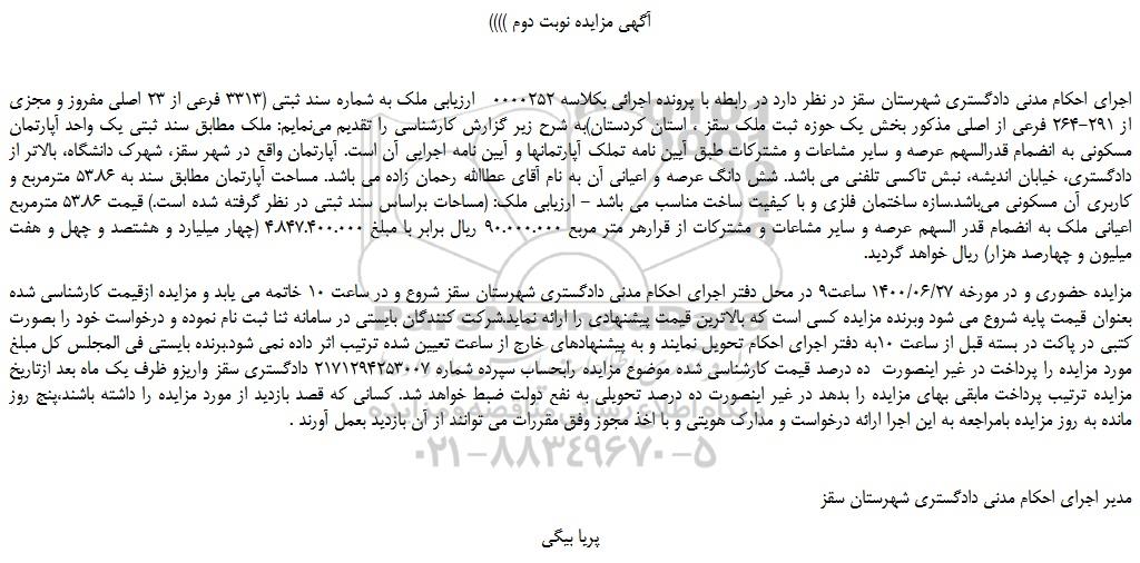 اجرای احکام مدنی دادگستری شهرستان سقز در نظر دارد در رابطه با پرونده اجرائی بکلاسه 0000252 ارزیابی ملک به شماره سند ثبتی (3313 فرعی از 23 اصلی مفروز و مجزی از 291-264 فرعی از اصلی مذکور بخش یک حوزه ثبت ملک سقز ، استان کردستان)به شرح زیر گزارش کارشناسی را تقدیم مینمایم: ملک مطابق سند ثبتی یک واحد آپارتمان مسکونی به انضمام قدرالسهم عرصه و سایر مشاعات و مشترکات طبق آیین نامه تملک آپارتمانها و آیین نامه اجرایی آن است. آپارتمان واقع در شهر سقز، شهرک دانشگاه، بالاتر از دادگستری، خیابان اندیشه، نبش تاکسی تلفنی می باشد. شش دانگ عرصه و اعیانی آن به نام آقای عطاالله رحمان زاده می باشد. مساحت آپارتمان مطابق سند به 53.86 مترمربع و کاربری آن مسکونی میباشد.سازه ساختمان فلزی و با کیفیت ساخت مناسب می باشد - ارزیابی ملک: (مساحات براساس سند ثبتی در نظر گرفته شده است.) قیمت 53.86 مترمربع اعیانی ملک به انضمام قدر السهم عرصه و سایر مشاعات و مشترکات از قرارهر متر مربع 90.000.000 ریال برابر با مبلغ 4.847.400.000 (چهار میلیارد و هشتصد و چهل و هفت میلیون و چهارصد هزار) ریال خواهد گردید.