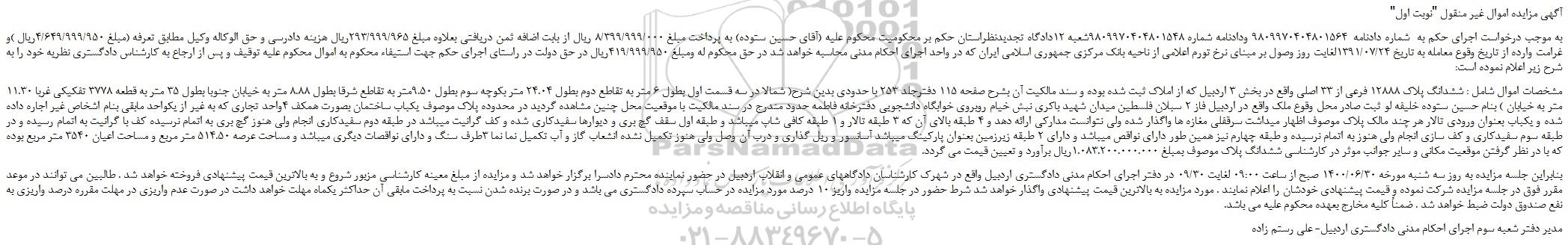 "آگهی مزایده اموال غیر منقول "نوبت اول
