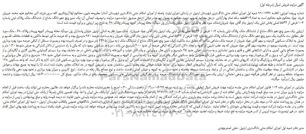شماره پرونده اجرایی: کلاسه 9901369 شعبه اول اجرای احکام مدنی دادگستری شهرستان اردبیل در راستای اجرای نیابت واصله از اجرای احکام مدنی دادگستری شهرستان آستارا مطروحه مابین، محکوم لها:آرزوتکریم کله سری فرزند اکبر محکوم علیه :محمد خبریان فرزند جواد محکوم علیه محکوم است به تعداد314قطعه سکه تمام بهارآزادی  درحق محکوم له ونیم درصد محکوم به بعنوان نیم عشر دولتی درحق صندوق دولت،مورد مزایده و توصیف اجمالی آن: یک ممیز پنج دهم دانگ مشاع از ششدانگ ملک پلاک ثبتی بشماره 107 فرعی از 5544 اصلی بخش ثبتی یک اردبیل بنام آقای جواد خبریان)،ملک مورد نظر به نشانی اردبیل خیابان پاسداران پل سیدآباد محله پیرمادر کوچه پیرمادر پلاک 68  به شرح زیر ارزیابی و برآورد قیمت شده است؛