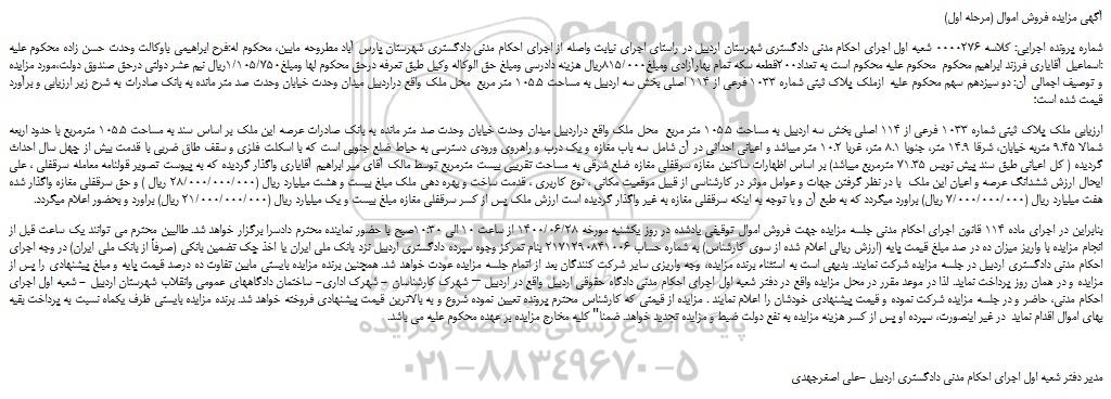 شماره پرونده اجرایی: کلاسه 0000276 شعبه اول اجرای احکام مدنی دادگستری شهرستان اردبیل در راستای اجرای نیابت واصله از اجرای احکام مدنی دادگستری شهرستان پارس آباد مطروحه مابین، محکوم له:فرح ابراهیمی باوکالت وحدت حسن زاده محکوم علیه :اسماعیل آقایاری فرزند ابراهیم محکوم محکوم علیه محکوم است به تعداد200قطعه سکه تمام بهارآزادی ومبلغ815/000ریال هزینه دادرسی ومبلغ حق الوکاله وکیل طبق تعرفه درحق محکوم لها ومبلغ1/105/750ریال نیم عشر دولتی درحق صندوق دولت،مورد مزایده و توصیف اجمالی آن: دو سیزدهم سهم محکوم علیه ازملک پلاک ثبتی شماره 1033 فرعی از 114 اصلی بخش سه اردبیل به مساحت 105.5 متر مربع محل ملک واقع دراردبیل میدان وحدت خیابان وحدت صد متر مانده به بانک صادرات به شرح زیر ارزیابی و برآورد قیمت شده است؛