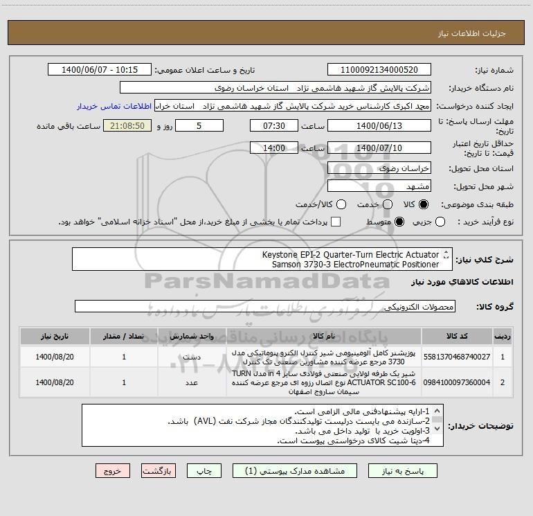 نام دستگاه خریدار:شرکت پالایش گاز شهید هاشمی نژاد استان خراسان رضوی