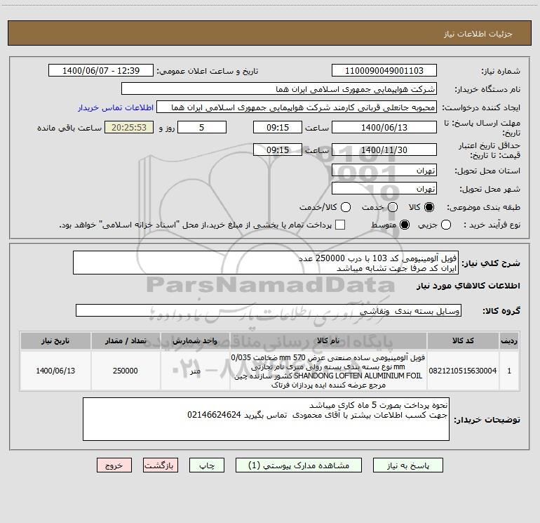 شرح کلی نیاز: فویل آلومینیومی کد 103 با درب 250000 عدد