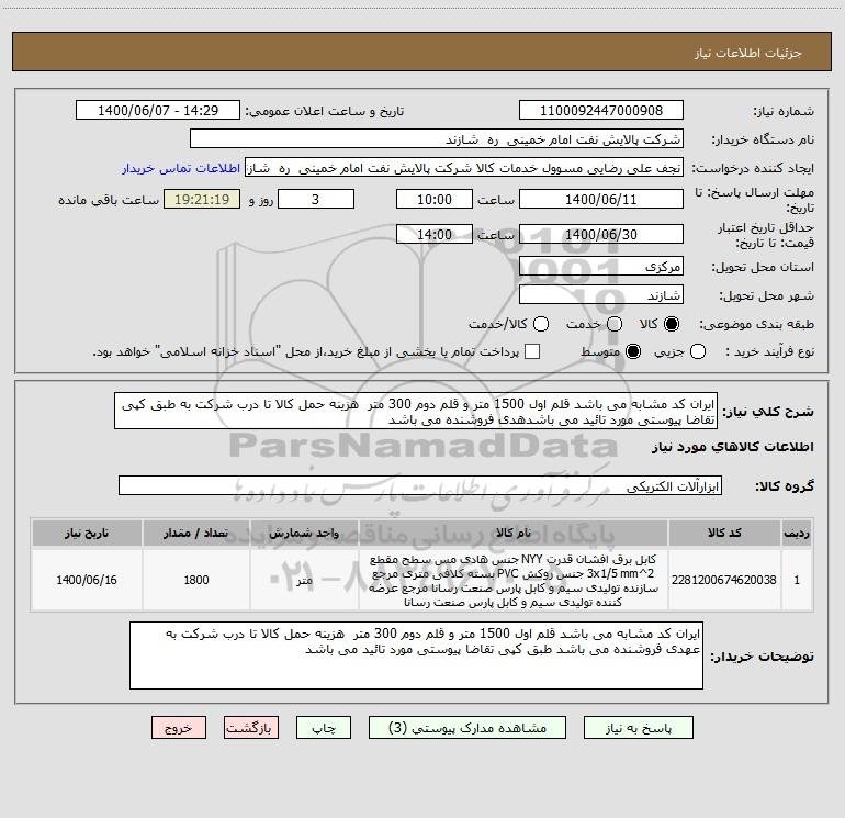 شرح کلی نیاز: ایران کد مشابه می باشد قلم اول 1500 متر و قلم دوم 300 متر هزینه حمل کالا تا درب شرکت به طبق کپی تقاضا پیوستی مورد تائید می باشدهدی فروشنده می باشد