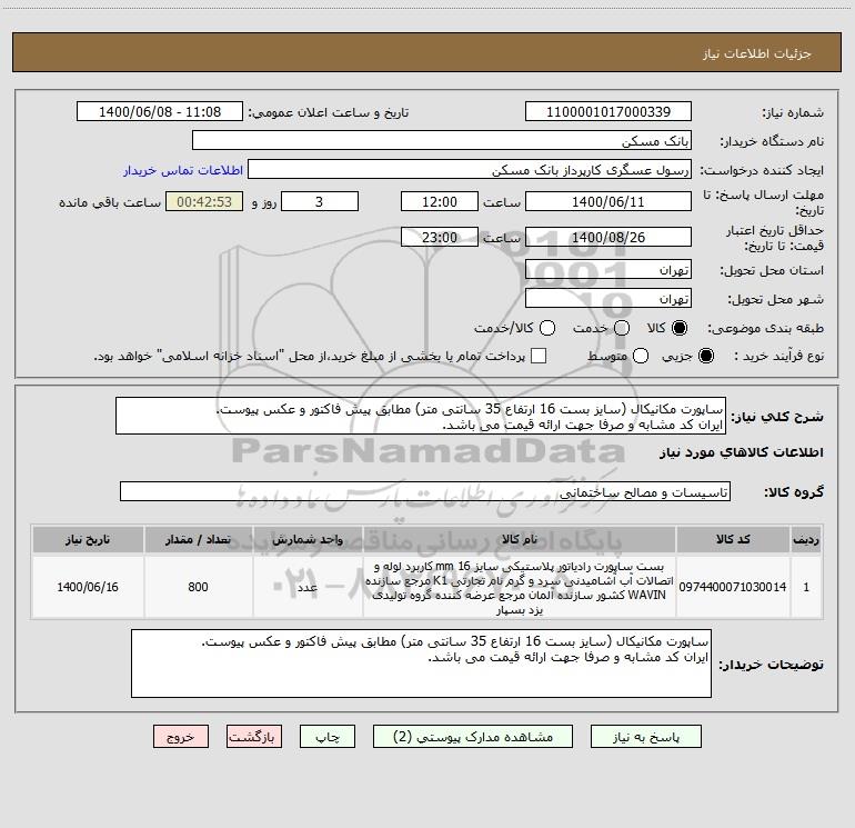استعلام بها و موضوع استعلام استعلام ساپورت مکانیکال (سایز بست 16 ارتفاع 35 سانتی متر) مطابق پیش فاکتور و عکس پیوست. ایران کد مشابه و صرفا جهت ارائه قیمت می باشد. به اطلاع کلیه شرکتها و افراد متخصص واجد شرایط میرساند، آگهی گذار در نظر دارد از طریق استعلام بها، نسبت به انتخاب و دریافت پیشنهادات اقدام نماید. این استعلام با کد آگهی ثبت شده در سامانه خبرگزاری پارس نماد : 3710147 منتشر شده است. مشخصات استعلام : تاریخ شروع استعلام: 1400/06/08 آخرین مهلت ارسال پیشنهاد قیمت : 1400/06/11 و محل اجرای پروژه : استان تهران میباشد. استعلام قیمت مورد درخواست : استعلام ساپورت مکانیکال (سایز بست 16 ارتفاع 35 سانتی متر) مطابق پیش فاکتور و عکس پیوست. ایران کد مشابه و صرفا جهت ارائه قیمت می باشد. با دستهبندیهای تخصصی و گروه های مرتبط : رادیاتور, تاسیسات ساختمانی, لوله و اتصالات, استعلام اطلاع رسانی میگردد. شرایط شرکت در استعلام آنلاین : ابتدا ثبت نام در سامانه استعلام پارس نماد و تکمیل مدارک موردنیاز و بارگذاری در سامانه رعایت تمامی ضوابط و الزامات مندرج در اسناد استعلام است.