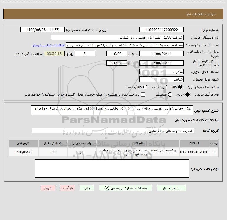 شرح کلی نیاز: پوکه معدنی(جنس پومیس پوزالان- سایز 04- رنگ خاکستری مقدار 100متر مکعب تحویل در شهرک مهاجران