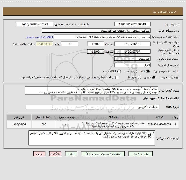شرح کلی نیاز: موف (مفصل ) پرسی مسی سایز 95 میلیمتر مربع تعداد 500 عدد موف (مفصل ) پرسی مسی سایز 125 میلیمتر مربع تعداد 500 عدد - طبق مشخصات فنی پیوست