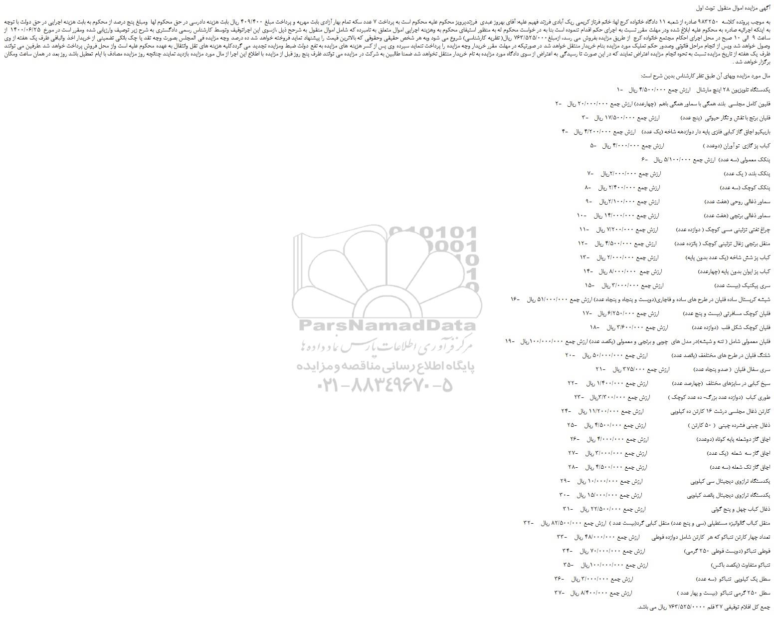 به موجب پرونده کلاسه 983250 صادره از شعبه 11 دادگاه خانواده کرج لها: خانم فرناز کریمی ریک آبادی فرزند فهیم علیه: آقای بهروز عبدی فرزندپرویز محکوم علیه محکوم است به پرداخت 7 عدد سکه تمام بهار آزادی بابت مهریه و پرداخت مبلغ 409/400 ریال بابت هزینه دادرسی در حق محکوم لها ومبلغ پنج درصد از محکوم به بابت هزینه اجرایی در حق دولت با توجه به اینکه اجرائیه صادره به محکوم علیه ابلاغ شده ودر مهلت مقرر نسبت به اجرای حکم اقدام ننموده است بنا به در خواست محکوم له به منظور استیفای محکوم به وهزینه اجرایی اموال متعلق به نامبرده که شامل اموال منقول به شرحح ذیل ،ازسوی این اجراتوقیف وتوسط کارشناس رسمی دادگستری به شرح زیر توصیف وارزیابی شده ومقرر است در مورخ 1400/06/25 از ساعت 9 الی 10 صبح در محل اجرای احکام مجتمع خانواده کرج از طریق مزایده بفروش می رسد، ازمبلغ763/525/000 ریال( نظریه کارشناسی) شروع می شود وبه هر شخص حقیقی وحقوقی که بالاترین قیمت را پیشنهاد نماید فروخته خواهد شد ده درصد وجه مزایده فی المجلس بصورت وجه نقد یا چک بانکی تضمینی از خریدار اخذ والباقی ظرف یک هفته از وی وصول خواهد شد وپس از انجام مراحل قانونی وصدور حکم تملیک مورد مزایده بنام خریدار منتقل خواهد شد در صورتیکه در مهلت مقرر خریدار وجه مزایده را پرداخت ننماید سپرده وی پس از کسر هزینه های مزایده به نفع دولت ضبط ومزایده تجدید می گرددکلیه هزینه های نقل وانتقال به عهده محکوم علیه است واز محل فروش پرداخت خواهد شد .طرفین می توانند ظرف یک هفته از تاریخ مزایده نسبت به نحوه انجام مزایده اعتراض نمایند که در این صورت تا رسیدگی به اعتراض از سوی دادگاه مورد مزایده به نام خریدار منتقل نخواهد شد ضمنا طالبین به شرکت در مزایده می توانند ظرف پنج روز قبل از مزایده با اطلاع این اجرا از مال مورد مزایده بازدید نمایند چنانچه روز مزایده مصادف با ایام تعطیل باشد روز بعد در همان ساعت ومکان برگزار خواهد شد .