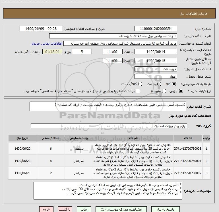 شرح کلی نیاز: کپسول آتش نشانی طبق مشخصات مندرج درفرم پیشنهاد قیمت پیوست ( ایران کد مشابه )
