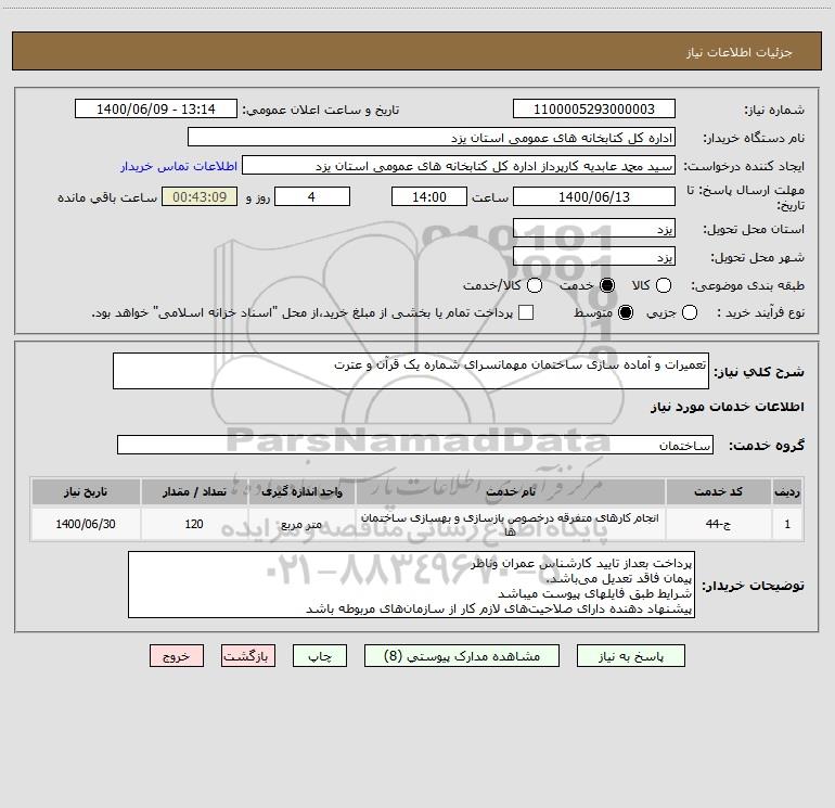 شرح کلی نیاز: تعمیرات و آماده سازی ساختمان مهمانسرای شماره یک قرآن و عترت