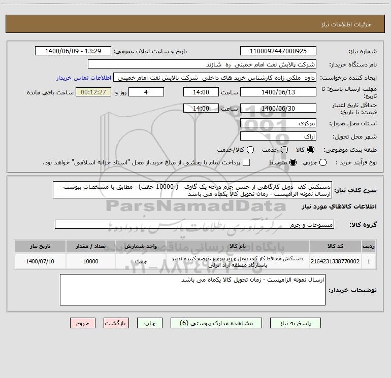 شرح کلی نیاز: دستکش کف دوبل کارگاهی از جنس چرم درجه یک گاوی ( 10000 حفت) - مطابق با مشخصات پیوست - ارسال نمونه الزامیست - زمان تحویل کالا یکماه می باشد