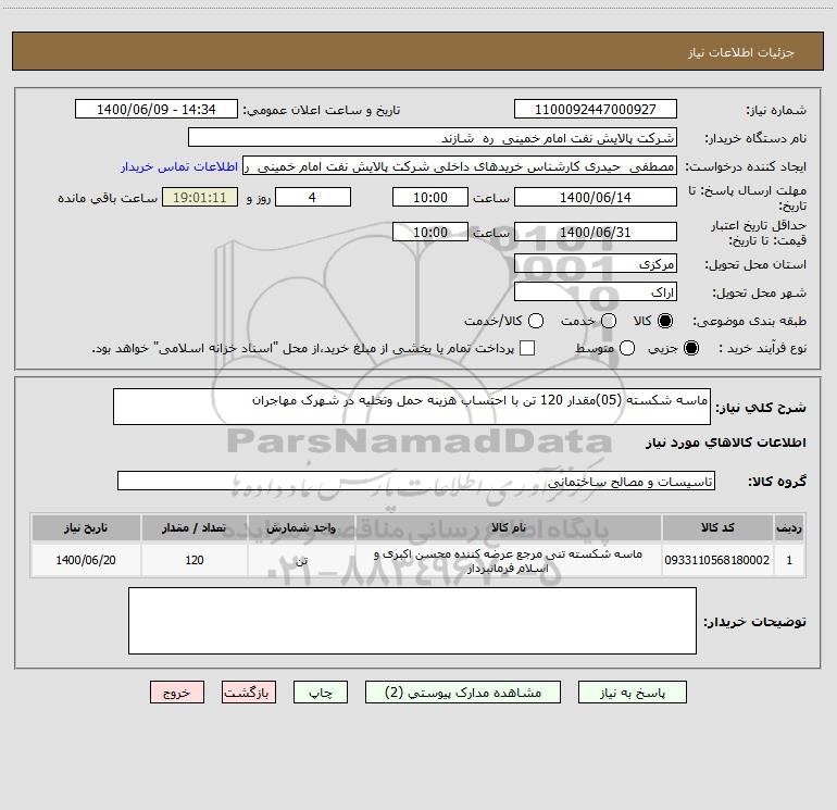 شرح کلی نیاز: ماسه شکسته (05)مقدار 120 تن با احتساب هزینه حمل وتخلیه در شهرک مهاجران