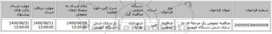 | 2000005366000008 | مناقصه عمومی یک مرحله ای باز سازی شش دستگاه اتوبوس | مناقصه عمومی | البرز | شهرداری نظرآباد | باز سازی شش دستگاه اتوبوس | 1400/06/09 13:20:00 | 1400/06/11 12:00:00 | 1400/06/21 12:00:00 |