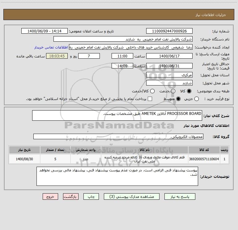 استعلام PROCESSOR BOARD آنالایزر AMETEK طبق مشخصات پیوست., استعلام PROCESSOR BOARD آنالایزر AMETEK طبق مشخصات پیوست.