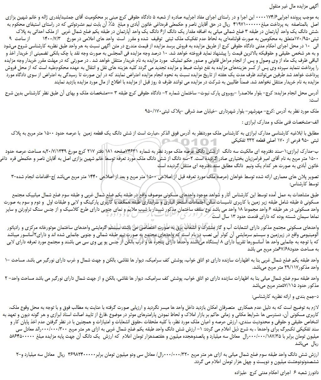 به موجب پرونده اجرایی0000174/6 این اجرا و در راستای اجرای مفاد اجراییه صادره از شعبه ۵ دادگاه حقوقی کرج مبنی بر محکومیت آقای جمشیدایلدری ژاله و خانم شهین بزازی اصل بالمناصفه به پرداخت مبلغ41971000000 ریال در حق آقایان ناصر و حکمعلی قره داغی خاتون آبادی و مبلغ ۵٪ آن بابت نیم عشردولتی که در راستای استیفای محکوم به ،شش دانگ یک واحد آپارتمان در طبقه ۳ ضلع شمالی میانی به اضافه مقدار یک دانگ از۶ دانگ یک واحد آپارتمان در طبقه یکم ضلع شمال غربی از ملک احداثی به پلاک ثبتی170/950متعلق به محکومین به صورت قولنامه ای به لحاظ عدم تفکیک ملک ثبتی توقیف شده و مقرر است واحد های اعلامی در مورخ 1400/7/3 از ساعت 9 الی 10 در محل اجرای احکام مدنی دادگاه حقوقی کرج از طریق مزایده به فروش برسد مزایده از قیمت مندرج در متن آگهی نسبت به هر واحد طبق نظریه کارشناسی شروع می شود و به هر شخص حقیقی و حقوقیکه بالاترین قیمت را پیشنهاد نماید فروخته خواهد شد. ۱۰ درصد وجه مزایده فی المجلس به صورت وجه نقد یا چک بانکی تضمینی از خریدار اخذ و الباقی ظرف یک ماه از وی وصول و پس از انجام مراحل قانونی و صدور حکم تملیک مورد مزایده به نام خریدار منتقل خواهد شد . در صورتی که در مهلت مقرر خریدار وجه مزایده را پرداخت ننماید سپرده وی پس از کسر هزینه های مزایده به نفع دولت ضبط و مزایده تجدید می گردد کلیه هزینه های نقل و انتقال به عهده محکوم علیه است که از محل فروش پرداخت خواهد شد طرفین می توانند ظرف مدت یک هفته از تاریخ مزایده نسبت به نحوه انجام مزایده اعتراض نمایند که در این صورت تا رسیدگی به اعتراض از سوی دادگاه مورد مزایده به نام خریدار منتقل نخواهد شد. ضمناً طالبین به شرکت در مزایده می توانند ظرف ۵ روز قبل از مزایده با اطلاع از مال مورد مزایده بازدید نمایند