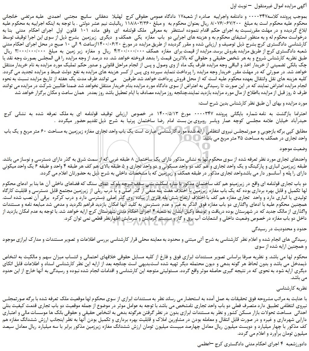 بموجب پرونده کلاسه0000347 و دادنامه واجراییه  صادره از شعبه17 دادگاه عمومی حقوقی کرج  لهلیلا  دهقانی  سانیچ  مجتبی  احمدی  علیه مرتضی  خانجانی محکوم علیه محکوم است به مبلغ  8/076/067/200 ریال بعنوان محکوم به  و مبلغ 118/803/360 ریالبابت نیم عشر دولتی . با توجه به اینکه اجراییه به محکوم علیه ابلاغ گردیده و در مهلت مقررنسبت به اجرای حکم اقدام ننموده استنظر  به معرفی  ملک قولنامه  ای  وفق  ماده  101  قانون  اول  اجرای احکام  مدنی  بنا به درخواست محکوم له و به منظور استیفای محکوم به و هزینه های اجرایی دو  باب  مغازه  یکی  همکف و  دیگری  زیرزمین  بشرح ذیل از سوی این اجرا توقیف توسط کارشناسی دادگستری کرج بشرح ذیل توصیف و ارزیابی شده و مقرر گردیده از طریق مزایده در مورخ 1400/06/20ازساعت 9 الی 10 صبح در محل اجرای احکام مدنی شعبه دادگستری کرج از طریق مزایده بفروش برسد. مزایده از قیمت برای  مغازه  همکف 4/200/000/000  ریال  و  مغازه  زیر زمین  به  مبلغ  3/000/000/000  ریال  طبق نظریه کارشناس شروع و به هر شخص حقیقی و حقوقی که بالاترین قیمت را بدهد فروخته خواهد شد. ده درصد از وجه مزایده را فی المجلس بصورت وجه نقد یا چک بانکی تضمینی از خریدار اخذ و الباقی وجه مزایده ظرف یک ماه از وی وصول و پس از انجام مراحل قانونی و صدور حکم تملیک مورد مزایده به نام خریدار منتقل خواهد شد. در صورتی که در مهلت مقرر خریدار وجه مزایده را پرداخت ننماید سپرده وی پس از کسر هزینه های مزایده به نفع دولت ضبط و مزایده تجدید می گردد. کلیه هزینه های نقل وانتقال بعهده محکوم علیه است که از محل فروش پرداخت خواهد شد طرفین    می توانند ظرف مدت یک هفته از تاریخ مزایده نسبت به نحوه انجام مزایده اعتراض نمایند که در این صورت تا رسیدگی به اعتراض از سوی دادگاه مورد مزایده بنام خریدار منتقل نخواهد شد ضمنا طالبین شرکت در مزایده می توانند ظرف 5 روز قبل از مزایده بااطلاع از مال مورد مزایده بازدید نمایند.چنانجه روز مزایده مصادف با ایام تعطیل باشد روز بعددر  همان ساعت و مکان برگزار خواهد شد
