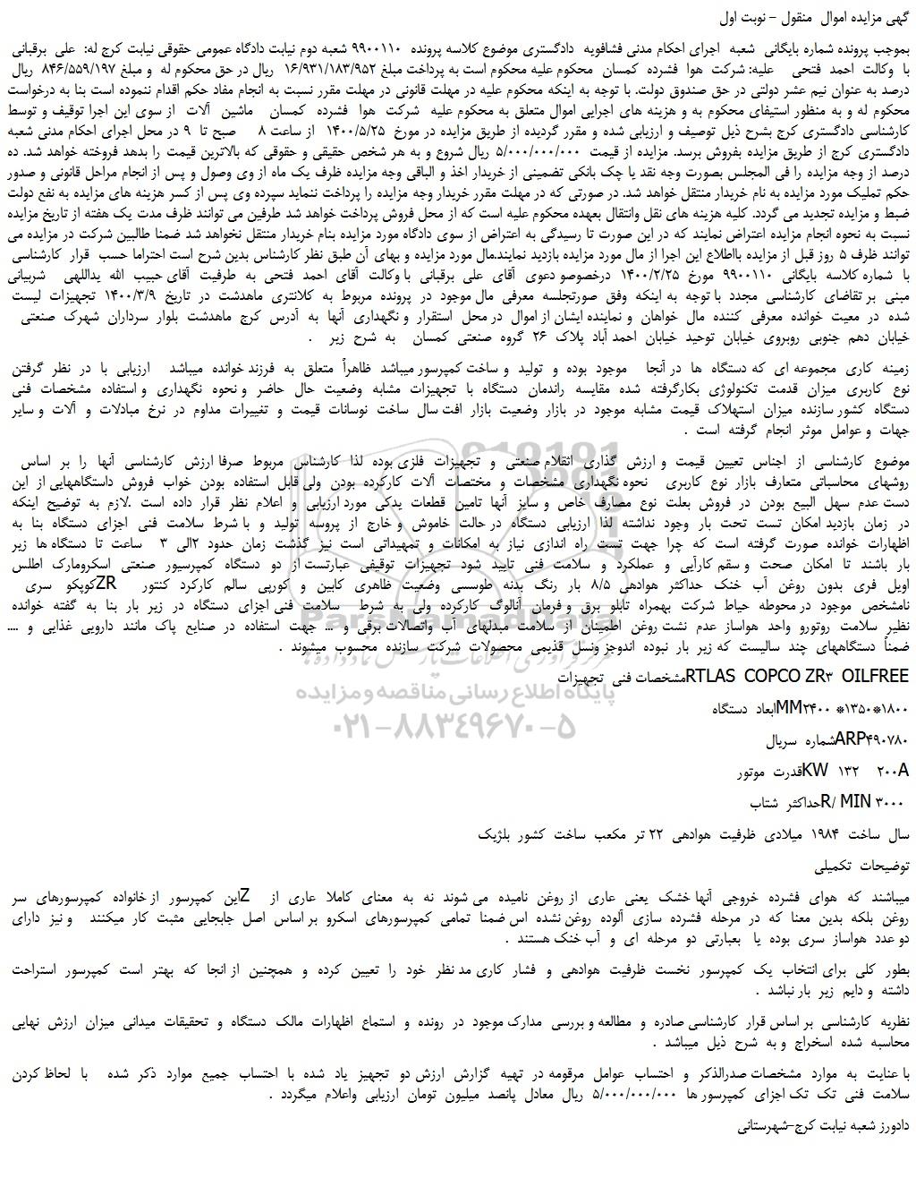 بموجب پرونده شماره بایگانی شعبه اجرای احکام مدنی فشافویه دادگستری موضوع کلاسه پرونده 9900110 شعبه دوم نیابت دادگاه عمومی حقوقی نیابت کرج له: علی برقبانی با وکالت احمد فتحی علیه: شرکت هوا فشرده کمسان محکوم علیه محکوم است به پرداخت مبلغ 16/931/183/952 ریال در حق محکوم له و مبلغ 846/559/197 ریال درصد به عنوان نیم عشر دولتی در حق صندوق دولت. با توجه به اینکه محکوم علیه در مهلت قانونی در مهلت مقرر نسبت به انجام مفاد حکم اقدام ننموده است بنا به درخواست محکوم له و به منظور استیفای محکوم به و هزینه های اجرایی اموال متعلق به محکوم علیه شرکت هوا فشرده کمسان ماشین آلات از سوی این اجرا توقیف و توسط کارشناسی دادگستری کرج بشرح ذیل توصیف و ارزیابی شده و مقرر گردیده از طریق مزایده در مورخ 1400/5/25 از ساعت 8 صبح تا 9 در محل اجرای احکام مدنی شعبه دادگستری کرج از طریق مزایده بفروش برسد. مزایده از قیمت 5/000/000/000 ریال شروع و به هر شخص حقیقی و حقوقی که بالاترین قیمت را بدهد فروخته خواهد شد. ده درصد از وجه مزایده را فی المجلس بصورت وجه نقد یا چک بانکی تضمینی از خریدار اخذ و الباقی وجه مزایده ظرف یک ماه از وی وصول و پس از انجام مراحل قانونی و صدور حکم تملیک مورد مزایده به نام خریدار منتقل خواهد شد. در صورتی که در مهلت مقرر خریدار وجه مزایده را پرداخت ننماید سپرده وی پس از کسر هزینه های مزایده به نفع دولت ضبط و مزایده تجدید می گردد. کلیه هزینه های نقل وانتقال بعهده محکوم علیه است که از محل فروش پرداخت خواهد شد طرفین می توانند ظرف مدت یک هفته از تاریخ مزایده نسبت به نحوه انجام مزایده اعتراض نمایند که در این صورت تا رسیدگی به اعتراض از سوی دادگاه مورد مزایده بنام خریدار منتقل نخواهد شد ضمنا طالبین شرکت در مزایده می توانند ظرف 5 روز قبل از مزایده بااطلاع این اجرا از مال مورد مزایده بازدید نمایند.مال مورد مزایده و بهای آن طبق نظر کارشناس بدین شرح است احتراما حسب قرار کارشناسی با شماره کلاسه بایگانی 9900110 مورخ 1400/2/25 درخصوصو دعوی آقای علی برقبانی با وکالت آقای احمد فتحی به طرفیت آقای حبیب الله یداللهی شربیانی مبنی بر تقاضای کارشناسی مجدد با توجه به اینکه وفق صورتجلسه معرفی مال موجود در پرونده مربوط به کلانتری ماهدشت در تاریخ 1400/3/9 تجهیزات لیست شده در معیت خوانده معرفی کننده مال خواهان و نماینده ایشان از اموال در محل استقرار و نگهداری آنها به آدرس کرج ماهدشت بلوار سرداران شهرک صنعتی خیابان دهم جنوبی روبروی خیابان توحید خیابان احمد آباد پلاک 26 گروه صنعتی کمسان به شرح زیر .