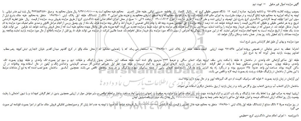 بموجب پرونده کلاسه 970545 و دادنامه واجراییه صادره از شعبه 12 دادگاه عمومی حقوقی کرج له دانیال اقتصاد راد وفاطمه حسینی توکلی علیه عادل ناصری محکوم علیه محکوم است به9/471/091/000 ریال بعنوان محکوم به و مبلغ 473/554/570 ریال بابت نیم عشر دولتی . با توجه به اینکه اجراییه به محکوم علیه ابلاغ گردیده و در مهلت مقررنسبت به اجرای حکم اقدام ننموده است بنا به درخواست محکوم له و به منظور استیفای محکوم به و هزینه های اجرایی 3 دانگ از ششدانگ طبقه اول پلاک ثبتی 168/3501 متعلق به محکوم علیه ملک بشرح ذیل از سوی این اجرا توقیف توسط کارشناسی دادگستری کرج بشرح ذیل توصیف و ارزیابی شده و مقرر گردیده از طریق مزایده در مورخ 1400/06/13 از ساعت 9 الی 10 صبح در محل اجرای احکام مدنی شعبه دادگستری کرج از طریق مزایده بفروش برسد. مزایده از قیمت ریال طبق نظریه کارشناس شروع و به هر شخص حقیقی و حقوقی که بالاترین قیمت را بدهد فروخته خواهد شد. ده درصد از وجه مزایده را فی المجلس بصورت وجه نقد یا چک بانکی تضمینی از خریدار اخذ و الباقی وجه مزایده ظرف یک ماه از وی وصول و پس از انجام مراحل قانونی و صدور حکم تملیک مورد مزایده به نام خریدار منتقل خواهد شد. در صورتی که در مهلت مقرر خریدار وجه مزایده را پرداخت ننماید سپرده وی پس از کسر هزینه های مزایده به نفع دولت ضبط و مزایده تجدید می گردد. کلیه هزینه های نقل وانتقال بعهده محکوم علیه است که از محل فروش پرداخت خواهد شد طرفین می توانند ظرف مدت یک هفته از تاریخ مزایده نسبت به نحوه انجام مزایده اعتراض نمایند که در این صورت تا رسیدگی به اعتراض از سوی دادگاه مورد مزایده بنام خریدار منتقل نخواهد شد ضمنا طالبین شرکت در مزایده می توانند ظرف 5 روز قبل از مزایده بااطلاع از مال مورد مزایده بازدید نمایند.چنانجه روز مزایده مصادف با ایام تعطیل باشد روز بعددر همان ساعت و مکان برگزار خواهد شد