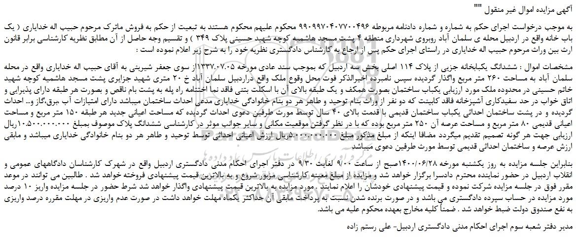 به موجب درخواست اجرای حکم به شماره و شماره دادنامه مربوطه 9909970407700496 محکوم علیهم محکوم هستند به تبعیت از حکم به فروش ماترک مرحوم حبیب اله خدایاری ( یک باب خانه واقع در اردبیل محله ی سلمان آباد روبروی شهرداری منطقه 4 پشت مسجد هاشمیه کوچه شهید حسینی پلاک 349 ) و تقسیم وجه حاصل از آن مطابق نظریه کارشناسی برابر قانون ارث بین وراث مرحوم حبیب اله خدایاری در راستای اجرای حکم پس از ارجاع به کارشناس دادگستری نظریه خود را به شرح زیر اعلام نموده است :