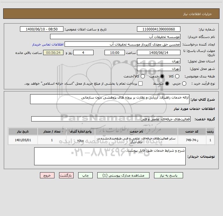 شرح کلی نیاز: ارائه خدمات راهبری، ارزیابی و نظارت بر پروژه های پژوهشی درون سازمانی