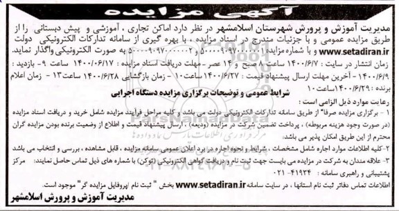 مدیریت آموزش و پرورش شهرستان اسلامشهر در نظر دارد اماکن تجاری ، آموزشی و پیش دبستانی را از طریق مزایده عمومی و با جزئیات مندرج در اسناد مزایده با بهره گیری از سامانه تدارکات الکترونیکی دولت ستاد ایران و با شماره مزایده 5000090970000001 و 5000090970000002 به صورت الکترونیکی واگذار نماید.