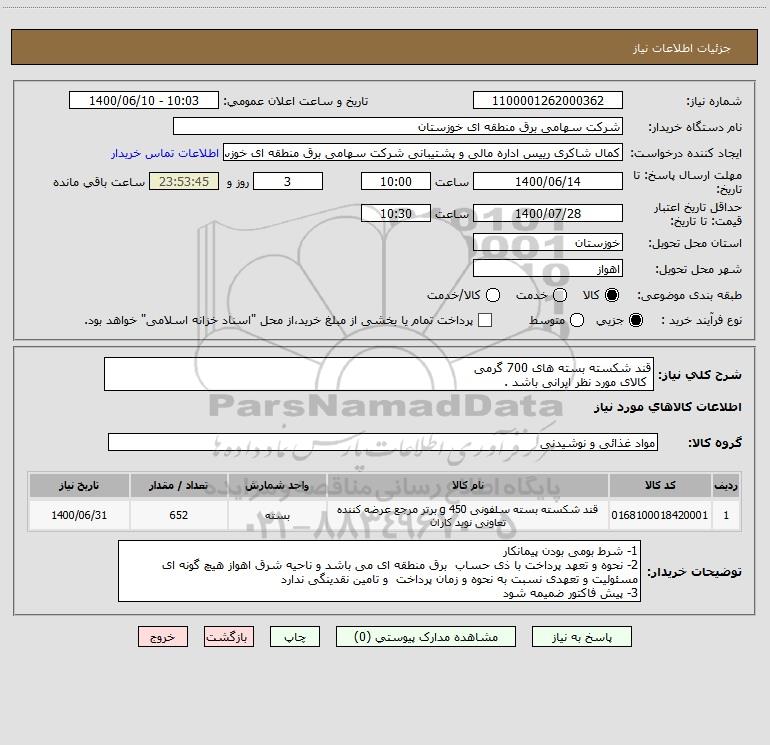 استعلام قند شکسته بسته های 700 گرمی کالای مورد نظر ایرانی باشد ., استعلام قند شکسته بسته های 700 گرمی کالای مورد نظر ایرانی باشد .