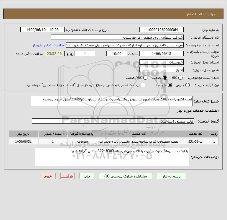 شرح کلی نیاز: نصب اکتیو پارت درتانک/مونتاژتجهیزات بیرونی وفیلتراسیون روغن ترانسفورماتور230kv/طبق شرح پیوست
