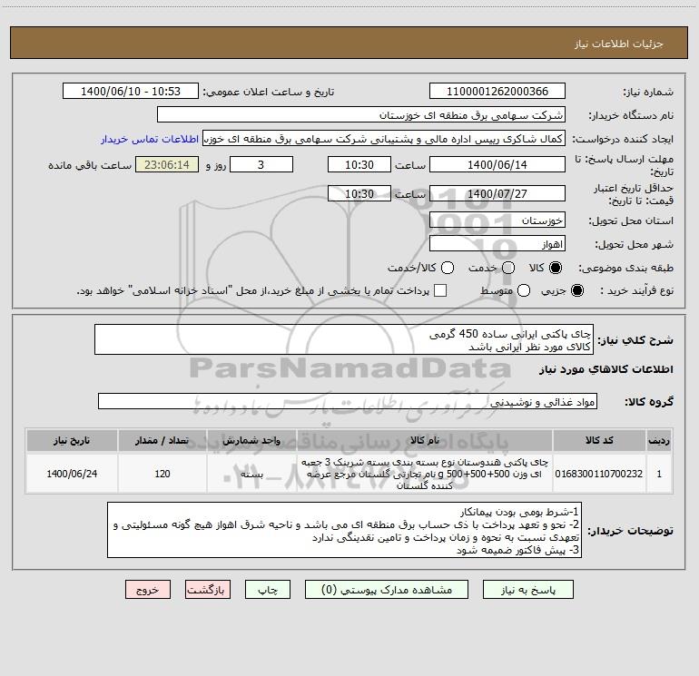 شرح کلی نیاز: چای پاکتی ایرانی ساده 450 گرمی