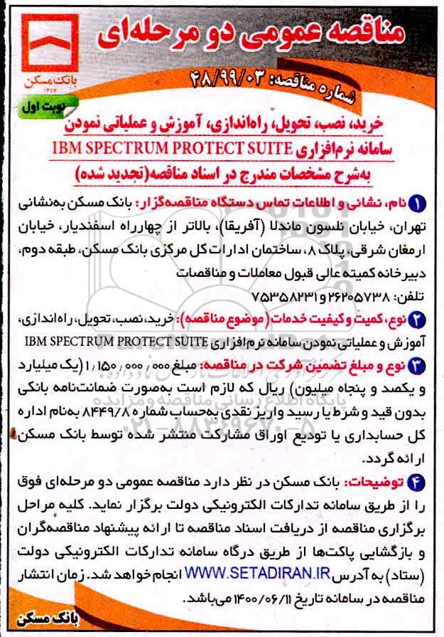 خرید نصب ، تحویل ، راه اندازی ، آموزش و عملیاتی نمودن سامانه نرم افزاری IBM SPECTRUM PROTECT SUITE به شرح مشخصات مندرج در اسناد مناقصه تجدید شده