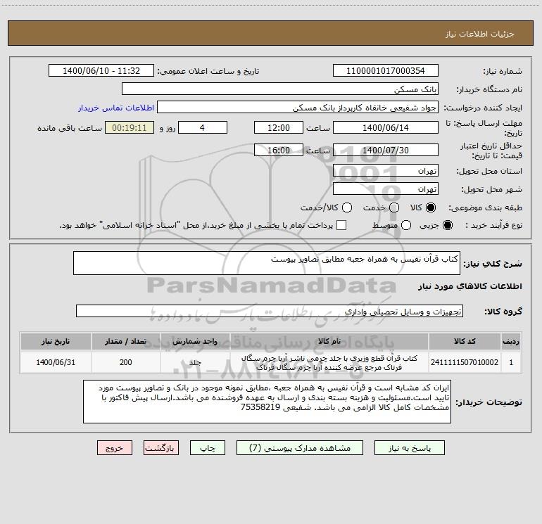 توضیحات خریدار:ایران کد مشابه است و قرآن نفیس به همراه جعبه ،مطابق نمونه موجود در بانک و تصاویر پیوست مورد تایید است.مسئولیت و هزینه بسته بندی و ارسال به عهده فروشنده می باشد.ارسال پیش فاکتور با مشخصات کامل کالا الزامی می باشد. شفیعی 75358219