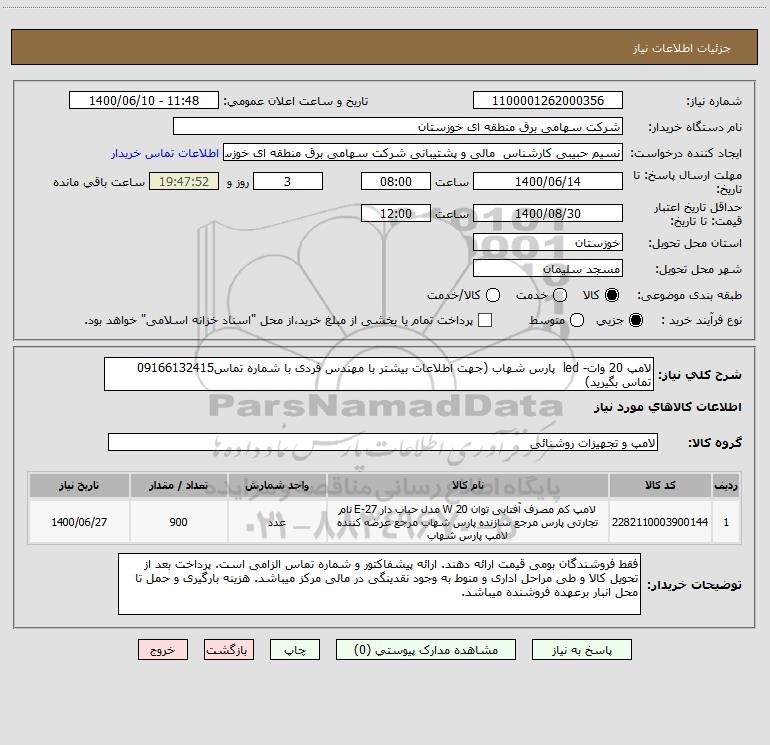 شرح کلی نیاز: لامپ 20 وات- led پارس شهاب (جهت اطلاعات بیشتر با مهندس فردی با شماره تماس09166132415 تماس بگیرید)