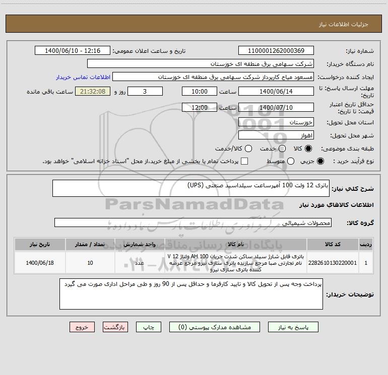 شرح کلی نیاز: باتری 12 ولت 100 آمپرساعت سیلداسید صنعتی (UPS)