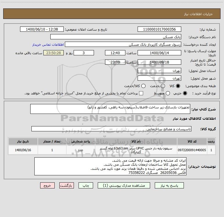 شرح کلی نیاز: تجهیزات بازسازی زیر ساخت فاضلاب(سیفون،سه راهی، کفشور و زانو)