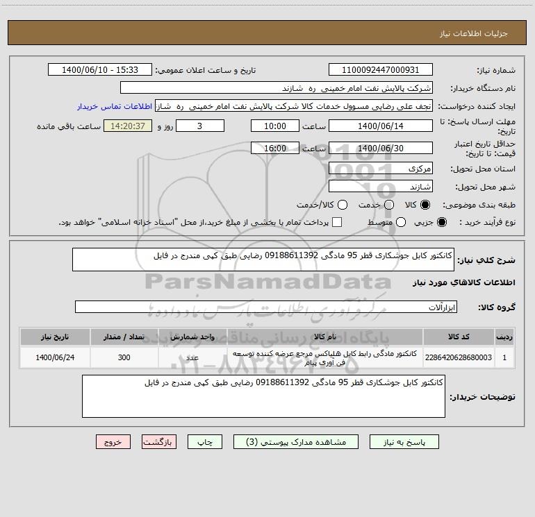 شرح کلی نیاز: کانکتور کابل جوشکاری قطر 95 مادگی 09188611392 رضایی طبق کپی مندرج در فایل
