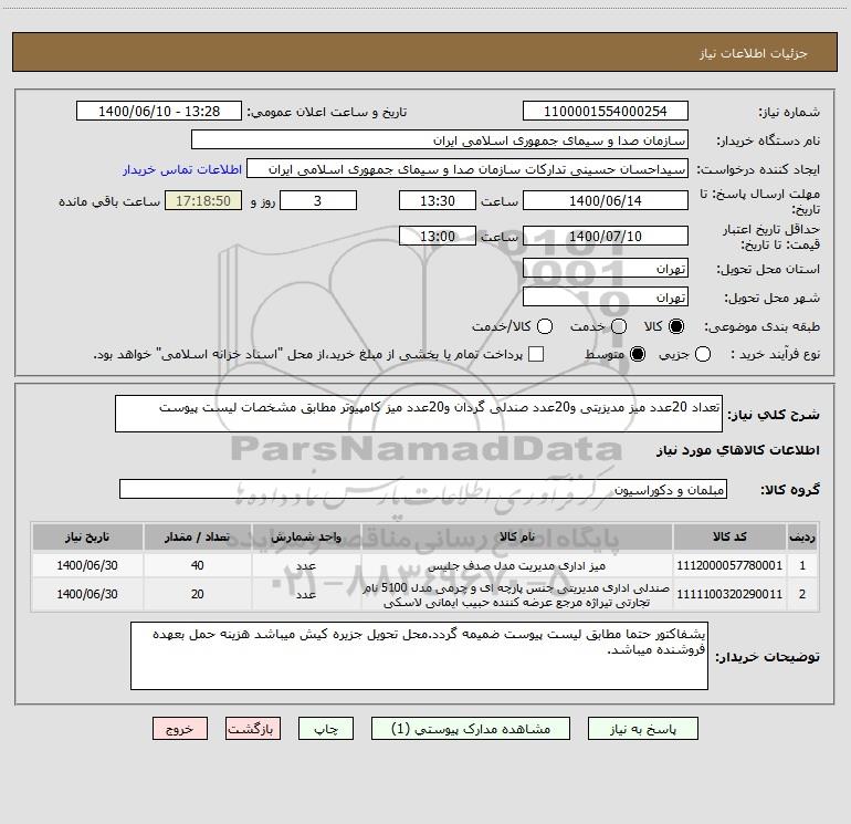 شرح کلی نیاز: تعداد 20عدد میز مدیزیتی و20عدد صندلی گردان و20عدد میز کامپیوتر مطابق مشخصات لیست پیوست