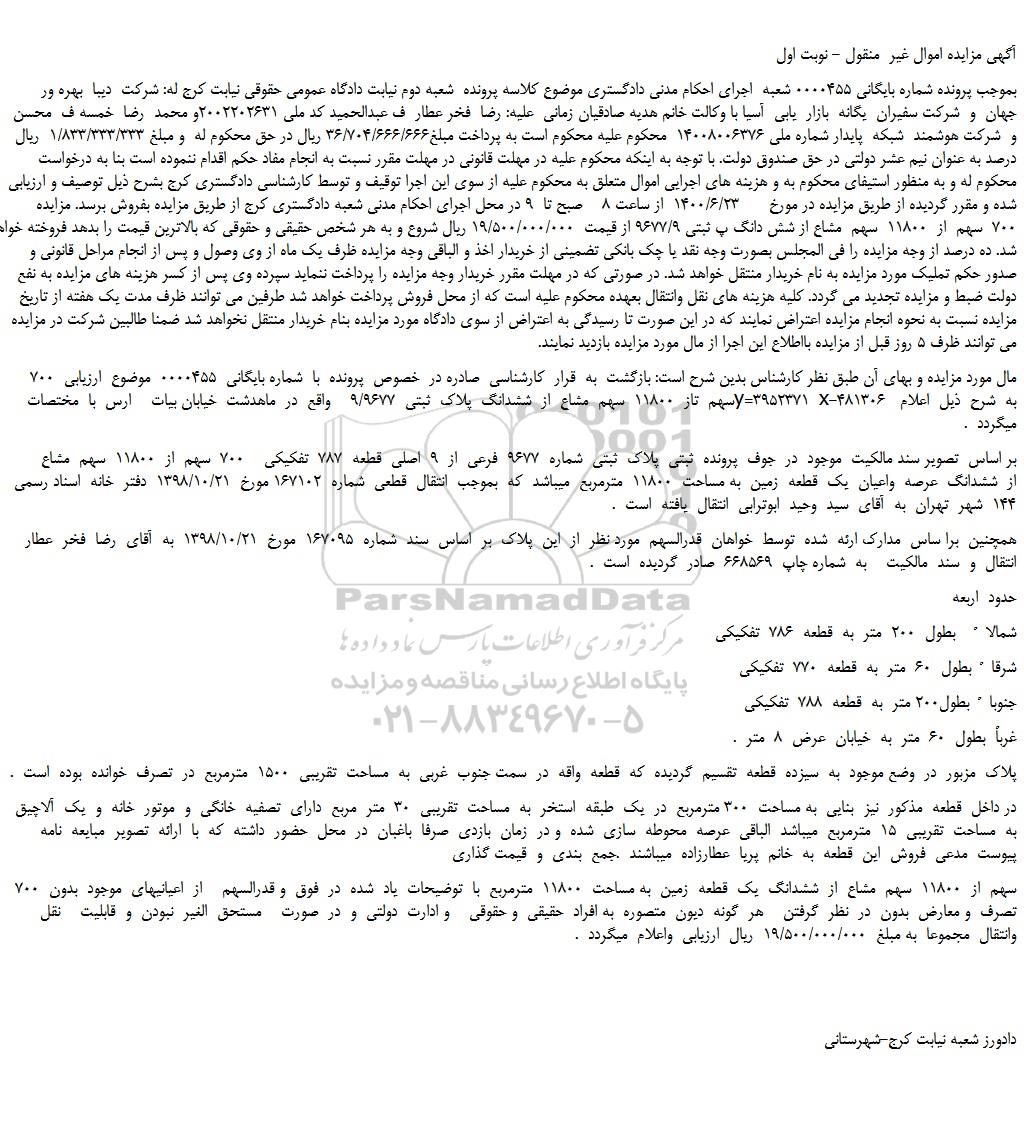 بموجب پرونده شماره بایگانی 0000455 شعبه اجرای احکام مدنی دادگستری موضوع کلاسه پرونده شعبه دوم نیابت دادگاه عمومی حقوقی نیابت کرج له: شرکت دیبا بهره ور جهان و شرکت سفیران یگانه بازار یابی آسیا با وکالت خانم هدیه صادقیان زمانی علیه: رضا فخر عطار ف عبدالحمید کد ملی 2002202631و محمد رضا خمسه ف محسن و شرکت هوشمند شبکه پایدار شماره ملی 14008006376 محکوم علیه محکوم است به پرداخت مبلغ36/704/666/666 ریال در حق محکوم له و مبلغ 1/833/333/333 ریال درصد به عنوان نیم عشر دولتی در حق صندوق دولت. با توجه به اینکه محکوم علیه در مهلت قانونی در مهلت مقرر نسبت به انجام مفاد حکم اقدام ننموده است بنا به درخواست محکوم له و به منظور استیفای محکوم به و هزینه های اجرایی اموال متعلق به محکوم علیه از سوی این اجرا توقیف و توسط کارشناسی دادگستری کرج بشرح ذیل توصیف و ارزیابی شده و مقرر گردیده از طریق مزایده در مورخ 1400/6/23 از ساعت 8 صبح تا 9 در محل اجرای احکام مدنی شعبه دادگستری کرج از طریق مزایده بفروش برسد. مزایده 700 سهم از 11800 سهم مشاع از شش دانگ پ ثبتی 9677/9 از قیمت 19/500/000/000 ریال شروع و به هر شخص حقیقی و حقوقی که بالاترین قیمت را بدهد فروخته خواهد شد. ده درصد از وجه مزایده را فی المجلس بصورت وجه نقد یا چک بانکی تضمینی از خریدار اخذ و الباقی وجه مزایده ظرف یک ماه از وی وصول و پس از انجام مراحل قانونی و صدور حکم تملیک مورد مزایده به نام خریدار منتقل خواهد شد. در صورتی که در مهلت مقرر خریدار وجه مزایده را پرداخت ننماید سپرده وی پس از کسر هزینه های مزایده به نفع دولت ضبط و مزایده تجدید می گردد. کلیه هزینه های نقل وانتقال بعهده محکوم علیه است که از محل فروش پرداخت خواهد شد طرفین می توانند ظرف مدت یک هفته از تاریخ مزایده نسبت به نحوه انجام مزایده اعتراض نمایند که در این صورت تا رسیدگی به اعتراض از سوی دادگاه مورد مزایده بنام خریدار منتقل نخواهد شد ضمنا طالبین شرکت در مزایده می توانند ظرف 5 روز قبل از مزایده بااطلاع این اجرا از مال مورد مزایده بازدید نمایند.
