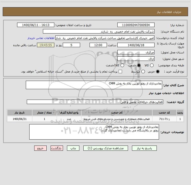 توضیحات خریدار:بعادبرداری از روتور توربین بخار به روش CMM روتور در پالایشگاه می بایست ابعادبرداری گردد.