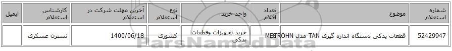 52429947 | قطعات یدکی دستگاه اندازه گیری TAN مدل METROHN | 8 | خرید تجهیزات وقطعات یدکی | کشوری | 1400/06/18 | نسترن عسکری |