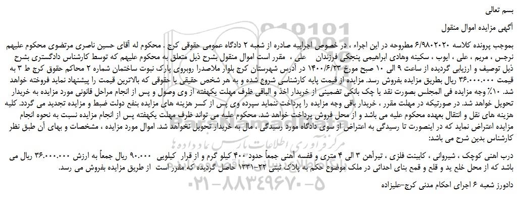 بموجب پرونده کلاسه 6/9802020 مطروحه در این اجراء ، در خصوص اجراییه صادره از شعبه 2 دادگاه عمومی حقوقی کرج . محکوم له آقای حسین ناصری مرتضوی محکوم علیهم نرجس ، مریم ، علی ، ایوب ، سکینه وهادی ابراهیمی پنجکی فرزندان علی ، مقرر است اموال منقول بشرح ذیل متعلق به محکوم علیهم که توسط کارشناس دادگستری بشرح ذیل توصیف و ارزیابی گردیده از ساعت 9 الی 10 صبح مورخ 1400/6/23 در آدرس شهرستان کرج بلوار ملاصدرا روبروی پارک نبوت ساختمان شماره 2 محاکم حقوق کرج ط 3 به قیمت 36.000.000 ریال بطریق مزایده بفروش رسد. مزایده از قیمت پایه کارشناسی شروع شده و به هر شخص حقیقی یا حقوقی که بالاترین قیمت را پیشنهاد نماید فروخته خواهد شد. 10% وجه مزایده فی المجلس بصورت نقد یا چک بانکی تضمینی از خریدار اخذ و الباقی ظرف مهلت یکهفته از وی وصول و پس از انجام مراحل قانونی مورد مزایده به خریدار تحویل خواهد شد. در صورتیکه در مهلت مقرر ، خریدار باقی وجه مزایده را پرداخت ننماید سپرده وی پس از کسر هزینه های مزایده بنفع دولت ضبط و مزایده تجدید می گردد. کلیه هزینه های نقل و انتقال بعهده محکوم علیه می باشد و از محل فروش پرداخت خواهد شد. محکوم علیه می تواند ظرف مهلت یکهفته پس از انجام مزایده نسبت به نحوه انجام مزایده اعتراض نماید که در اینصورت تا رسیدگی به اعتراض از سوی دادگاه مورد رسیدگی ، مال به خریدار تحویل نخواهد شد. اموال مورد مزایده ، مشخصات و بهای آن طبق نظر کارشناس بدین شرح می باشد:
