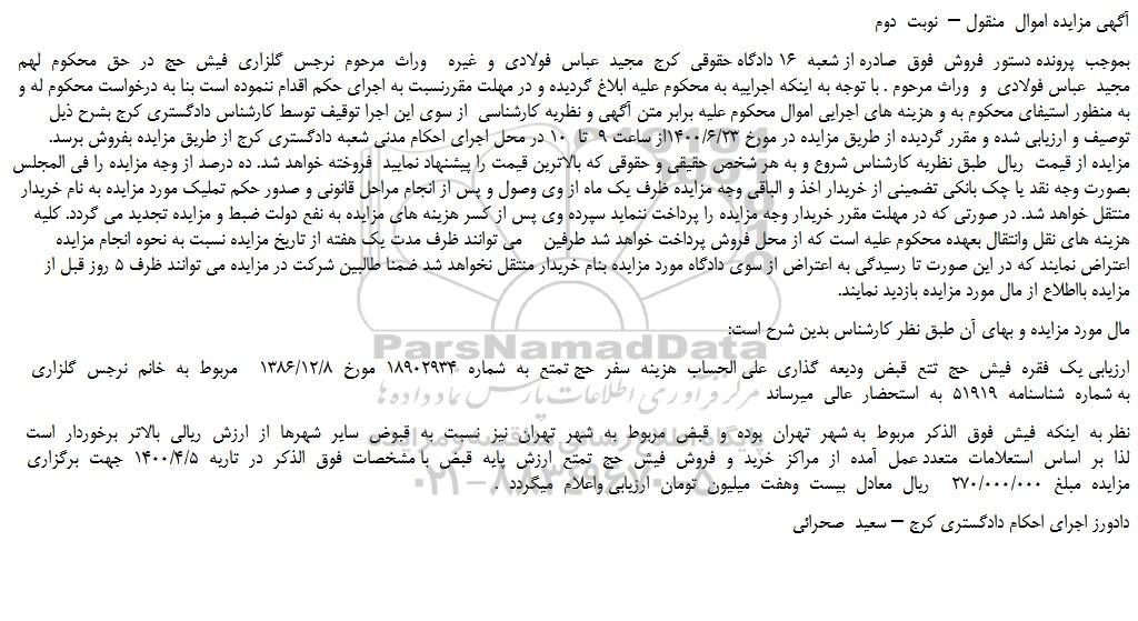 بموجب  پرونده دستور  فروش  فوق  صادره از شعبه  16 دادگاه حقوقی  کرج  مجید  عباس  فولادی  و  غیره    وراث  مرحوم  نرجس  گلزاری  فیش  حج  در  حق  محکوم  لهم  مجید  عباس فولادی  و  وراث مرحوم . با توجه به اینکه اجراییه به محکوم علیه ابلاغ گردیده و در مهلت مقررنسبت به اجرای حکم اقدام ننموده است بنا به درخواست محکوم له و به منظور استیفای محکوم به و هزینه های اجرایی اموال محکوم علیه برابر متن آگهی و نظریه کارشناسی  از سوی این اجرا توقیف توسط کارشناس دادگستری کرج بشرح ذیل توصیف و ارزیابی شده و مقرر گردیده از طریق مزایده در مورخ 1400/6/23از ساعت 9  تا  10 در محل اجرای احکام مدنی شعبه دادگستری کرج از طریق مزایده بفروش برسد. مزایده از قیمت  ریال  طبق نظریه کارشناس شروع و به هر شخص حقیقی و حقوقی که بالاترین قیمت را پیشنهاد نمایید  فروخته خواهد شد. ده درصد از وجه مزایده را فی المجلس بصورت وجه نقد یا چک بانکی تضمینی از خریدار اخذ و الباقی وجه مزایده ظرف یک ماه از وی وصول و پس از انجام مراحل قانونی و صدور حکم تملیک مورد مزایده به نام خریدار منتقل خواهد شد. در صورتی که در مهلت مقرر خریدار وجه مزایده را پرداخت ننماید سپرده وی پس از کسر هزینه های مزایده به نفع دولت ضبط و مزایده تجدید می گردد. کلیه هزینه های نقل وانتقال بعهده محکوم علیه است که از محل فروش پرداخت خواهد شد طرفین    می توانند ظرف مدت یک هفته از تاریخ مزایده نسبت به نحوه انجام مزایده اعتراض نمایند که در این صورت تا رسیدگی به اعتراض از سوی دادگاه مورد مزایده بنام خریدار منتقل نخواهد شد ضمنا طالبین شرکت در مزایده می توانند ظرف 5 روز قبل از مزایده بااطلاع از مال مورد مزایده بازدید نمایند.