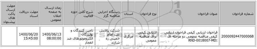 مناقصه، فراخوان ارزیابی کیفی فراخوان ارزیابی کیفی مناقصه عمومی دو مرحله ای :RND-0018007-MD از کلیه افراد متخصص و شرکتها واجد شرایط دعوت به عمل میآید در مناقصه با کد خبرگزاری پارس نماد: 3725021 شرکت نمایند.