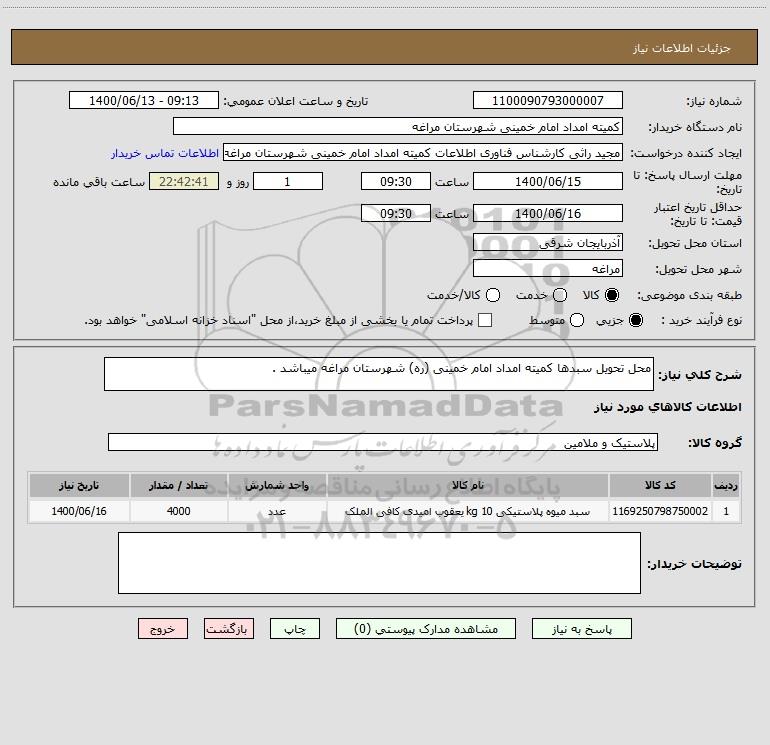 شرح کلی نیاز: محل تحویل سبدها کمیته امداد امام خمینی (ره) شهرستان مراغه میباشد .
