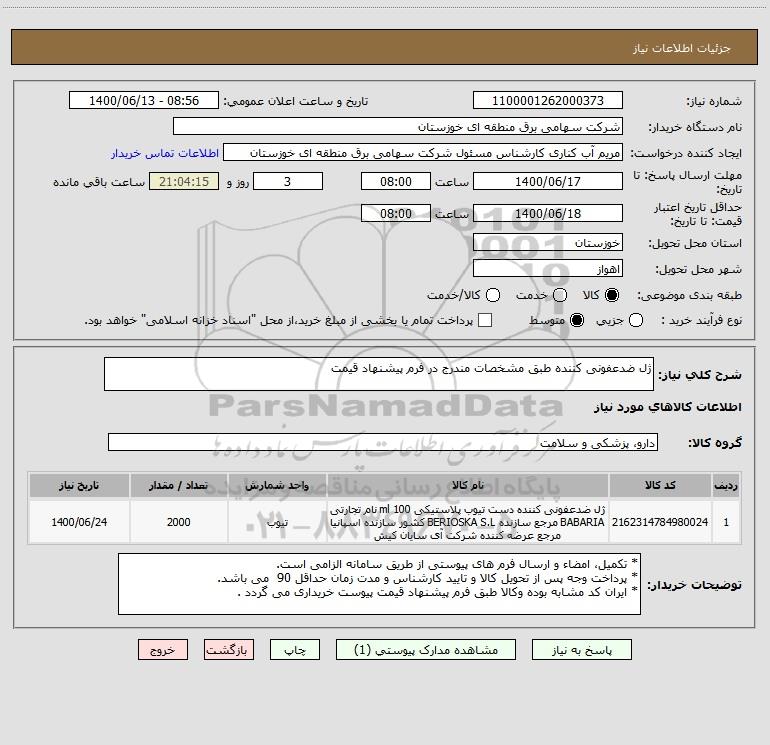 شرح کلی نیاز: ژل ضدعفونی کننده طبق مشخصات مندرج در فرم پیشنهاد قیمت