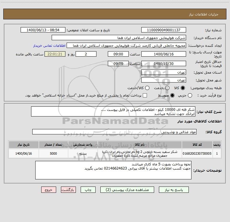شرح کلی نیاز: شکر فله ای 10000 کیلو - اطلاعات تکمیلی در فایل پیوست ....