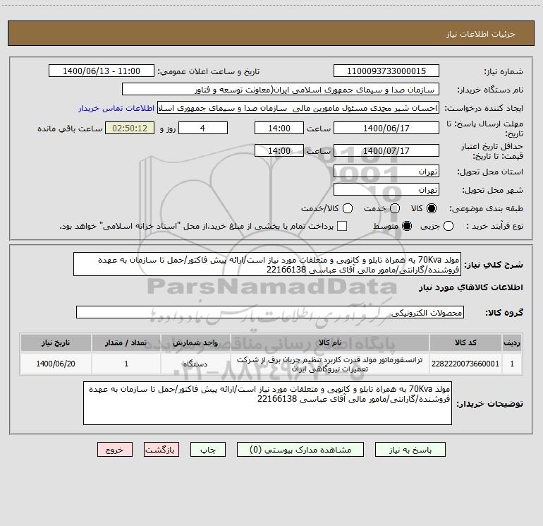 شرح کلی نیاز: مولد 70Kva به همراه تابلو و کانوپی و متعلقات مورد نیاز است/ارائه پیش فاکتور/حمل تا سازمان به عهده فروشنده/گارانتی/مامور مالی آقای عباسی 22166138