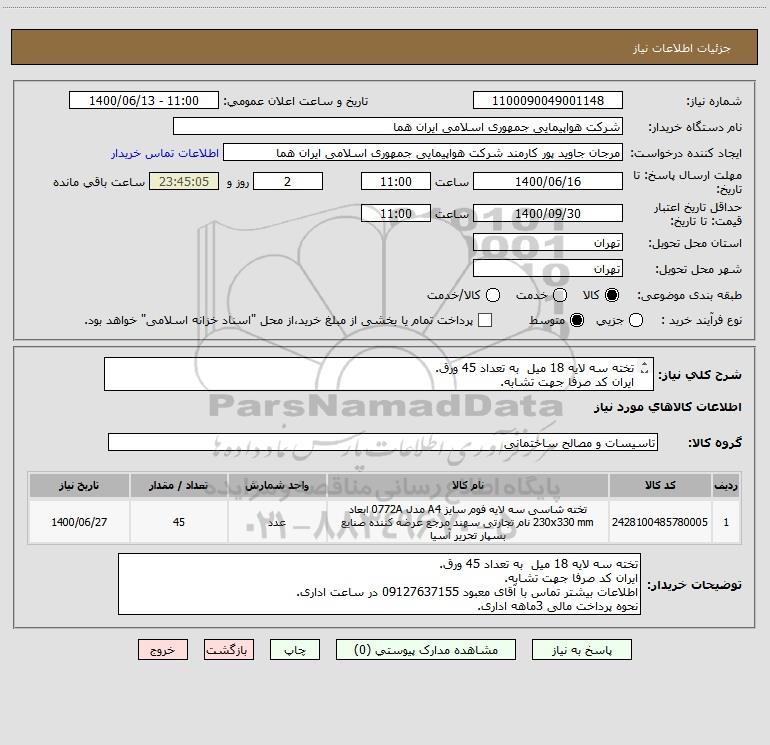 شرح کلی نیاز: تخته سه لایه 18 میل به تعداد 45 ورق.