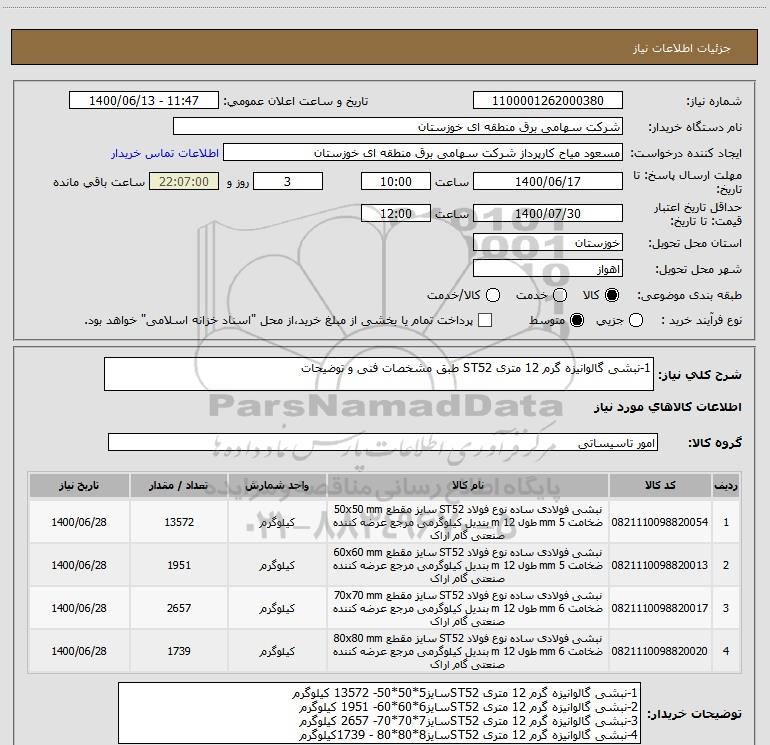 شرح کلی نیاز: 1-نبشی گالوانیزه گرم 12 متری ST52 طبق مشخصات فنی و توضیحات
