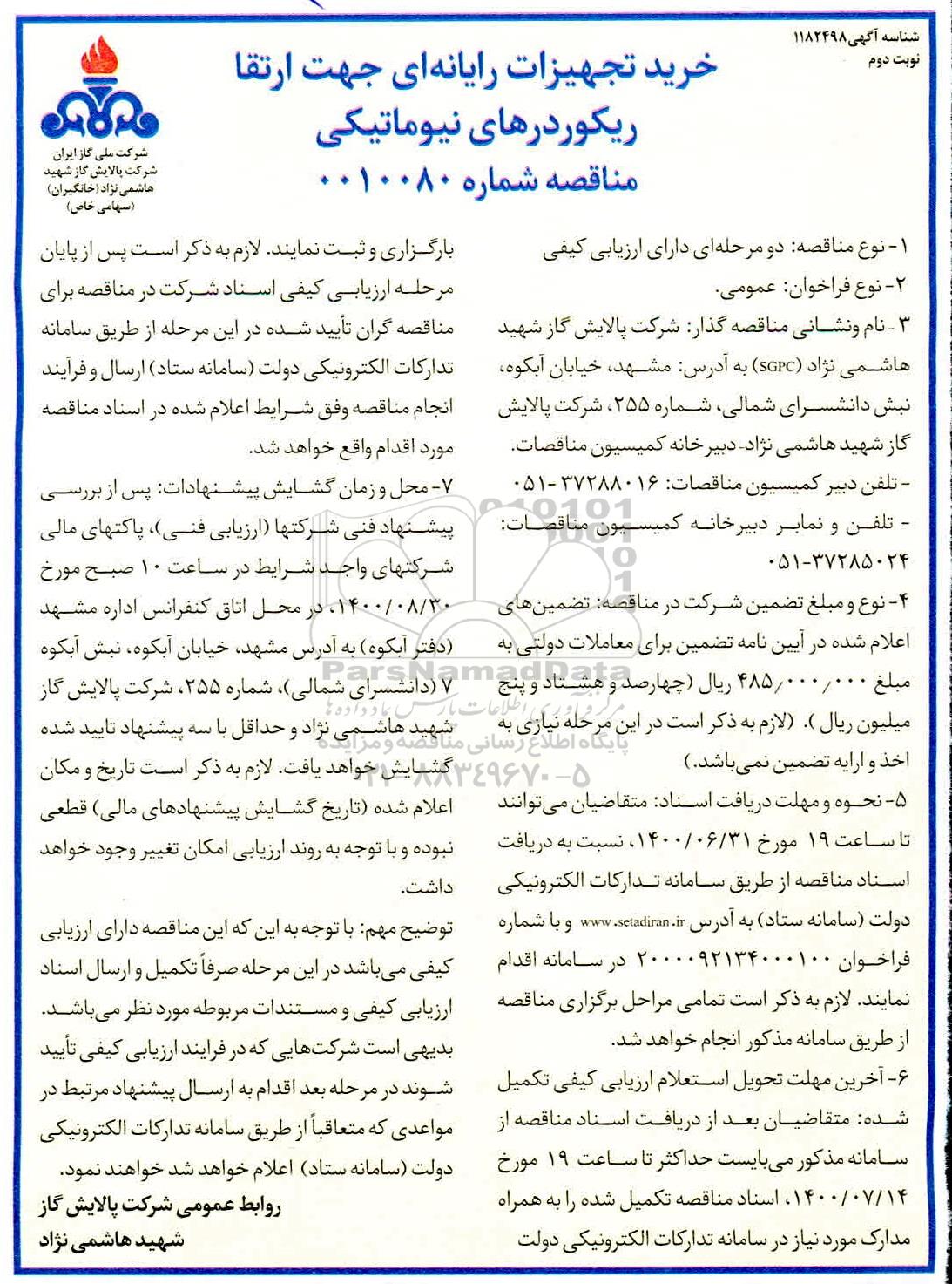 7- محل و زمان گشایش پیشنهادات: پس از بررسی پیشنهاد فنی شرکت‌ها (ارزیابی فنی)، پاکت‌های مالی شرکت‌های واجد شرایط ساعت 10 صبح مورخ 1400.8.30  در محل اتاق کنفرانس اداره مشهد (دفتر آبکوه) به آدرس مشهد، خیابان آبکوه، نبش دانشسرای شمالی، شماره 255، شرکت پالایش گاز شهید هاشمی نژاد و حداقل با سه پیشنهاد تأیید شده گشایش خواهد یافت. لازم به ذکر است تاریخ و مکان اعلام شده (تاریخ گشایش پیشنهادهای مالی) قطعی نبوده و با توجه به روند ارزیابی امکان تغییر وجود خواهد داشت.
