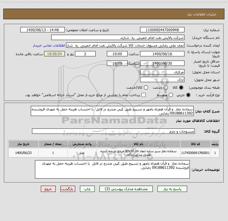 شرح کلی نیاز: سجاده نماز و قرآن همراه بامهر و تسبیح طبق کپی مندرج در فایل با احتساب هزینه حمل به عهدی فروشنده 09188611392 رضایی