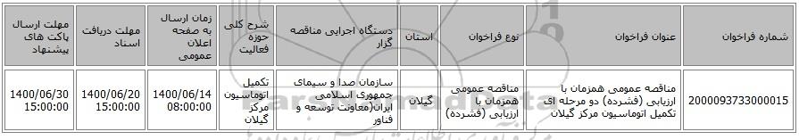 مناقصه، مناقصه عمومی همزمان با ارزیابی (فشرده) دو مرحله ای تکمیل اتوماسیون مرکز گیلان, مناقصه عمومی همزمان با ارزیابی (فشرده) دو مرحله ای تکمیل اتوماسیون مرکز گیلان